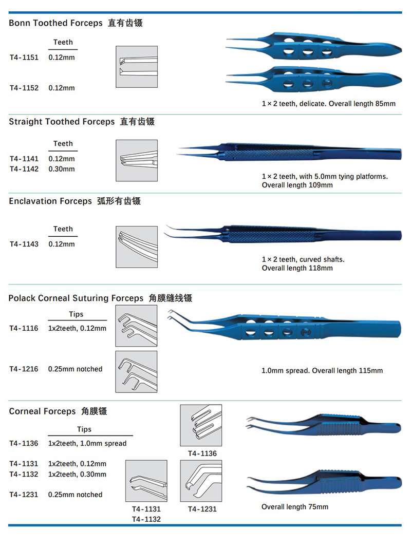 There are Kelman-Mcpherson Lens Forceps, Lens Implantation Forceps, Lens Folding Forceps, Akahoshi Prechopper, Nucleus Removal Forceps, Nucleus Forceps, Conjunctiva Forceps,and so on.